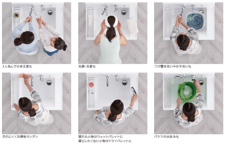↑クリックすると、ひろびろボウル&くるくる水栓などピアラの便利さをメーカーのページでご覧頂けます