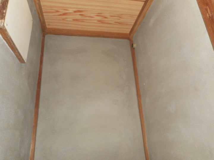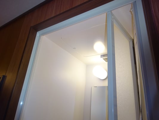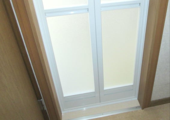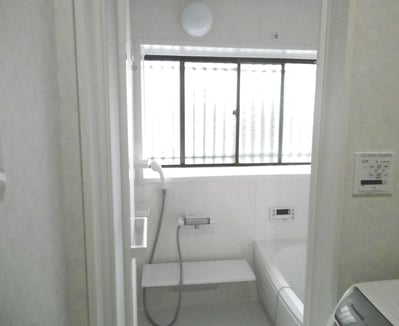 浴室の中に、浴室と洗面所を設置しました。部屋の真ん中に間仕切り製作し、浴室部の床を一部解体して土間を打ちました。既存の窓も洋室側を小さくし、浴室側の窓はルーバ―窓を設置しました。