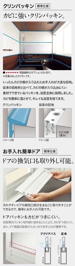 アクリアバスではカビに強い樹脂製のクリンパッキンが標準仕様です。カビの根が入り込まないから簡単に落とせてキレイを保てます。
