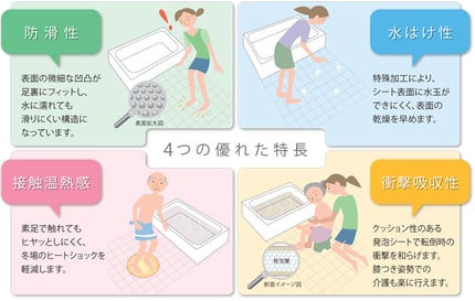冬場の寒い中、タイルに足をつけるとヒヤリとしますが、床シートを貼ることによりクッション性・断熱性も良くヒートショックの心配もいらず安心してお風呂が入っていただけます。コチラの商品は、介護保険給付の対象である住宅改修「浴室床材を滑りにくいものへ変更」に該当します。