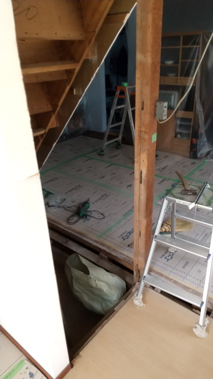 既存の床を剥がし断熱材を敷き込み、上からコンパネを貼ります。