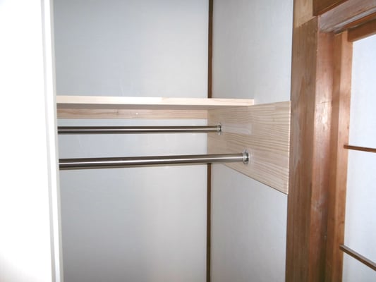 棚の造作や洋服掛けを作りスッキリと収納ができるようになりました。