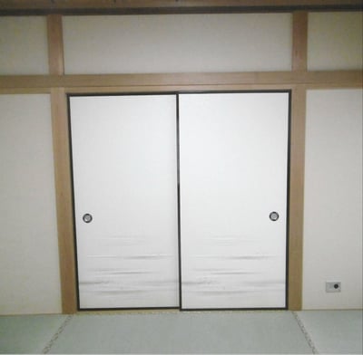 1日目に襖をお預かりしキズついた箇所を補修し新しい襖紙を貼り、2日目に張替えた襖を取付けました。