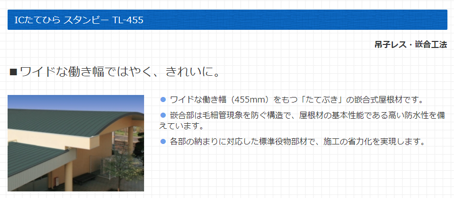 スタンビーTL‐455は吊子一体型の嵌合式で、施工が早いだけでなく基本性能である止水性の優れた屋根材です。