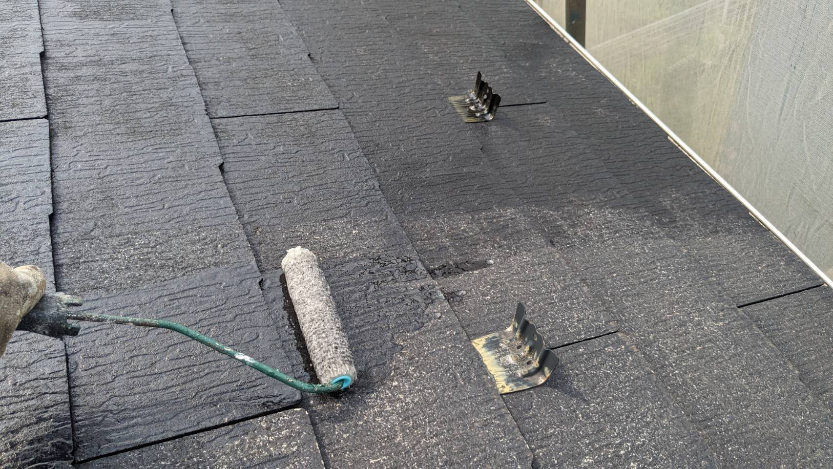 続いて高圧洗浄、下塗り、中塗り、上塗りを既存屋根部分に進めていきます。