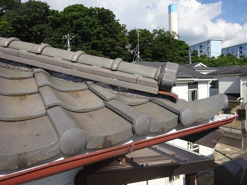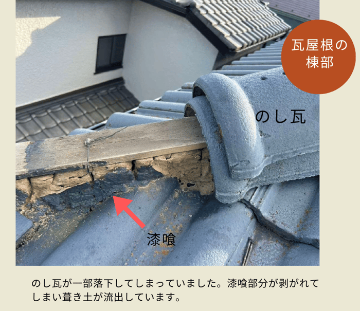しっかり点検させていただくと屋根の上では瓦屋根の棟部(むねぶ)の劣化が確認されました。