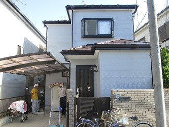 外壁塗装と一緒に屋根塗装も施工させていただきました。「サーモアイシリーズ」の『サーモアイSi』で塗装しました。耐久性・遮熱性にとても優れているので、この夏に発揮に期待です。同時に、外壁塗装も施工しましたのでご覧ください。