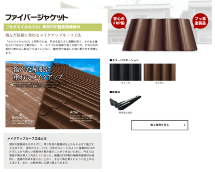 使用した屋根材はかわらU専用屋根補修材「ファイバージャケット」です。既存の瓦と同形の為、美観を保てそのまま重ねるだけなので工期も短くて済みますし、リーズナブルです。丈夫なFRP素材で酸性雨にも強い耐久性があり安心です。棟部分は塗装をしました。雪止め金具も設置しました。
